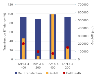 The data show that changes in formulation parameters had little to no impact on transfection efficiency, which remained close to 100%, or on cell viability, which stayed high with low cell death (<15%). However, protein expression levels did vary between samples. The markedly lower mean fluorescence intensity observed for the first sample (TAM 4-9 700) is most likely due to its lower encapsulation yield, as discussed previously. Differences among the remaining samples are likely driven by the combined effects of encapsulation yield, nanoparticle size, and other formulation parameters that influence cellular uptake.